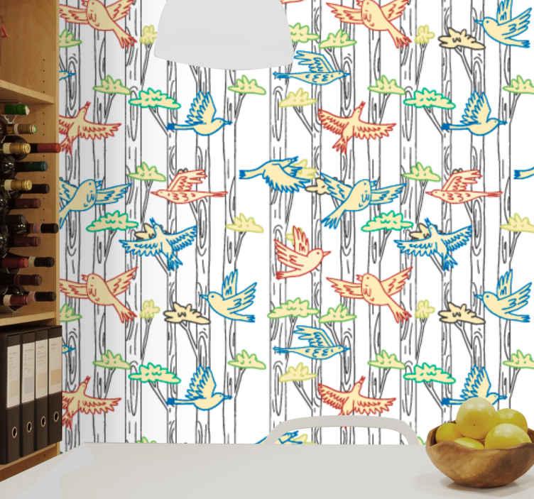 Ağaçlar arasında bu soyut uçan kuşların güzelliği ile evinizi dekore edin. Bu ürün renklidir ve bir odanın görünümünü aydınlatır. Kaliteli malzemeden üretilmiştir, solmaz ve dış etkilerden etkilenmez. Yüklemek istediğiniz herhangi bir alanda harika olurdu. Bazı uygulama araçlarına ihtiyacınız olacaktır, böylece bu duvar kağıdını bir duvara mükemmel şekilde monte edebilirsiniz. Ayrıca web sitemizde başka harika desenli vinil duvar kağıdı tasarımları da bulunmaktadır.