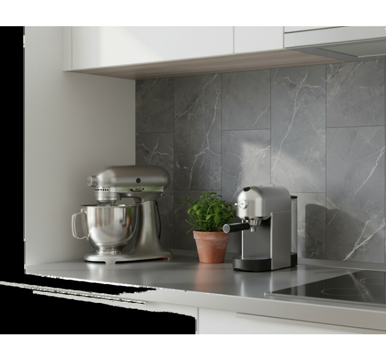 Referans: A53854Çağdaş bir mutfak sahnesi, modern aletlerle doludur; bir karıştırıcı makinesi ve bir espresso makinesi belirgin bir şekilde sergilenmektedir. Küçük bir saksı bitkisi, mutfağın estetiğini artırarak yeşillik katmaktadır. Şık, gri mermer arka plan, mutfakta işlevselliği ve şıklığı vurgulayarak, mutfak yaratıcılığı için mükemmel bir alan sunmaktadır.