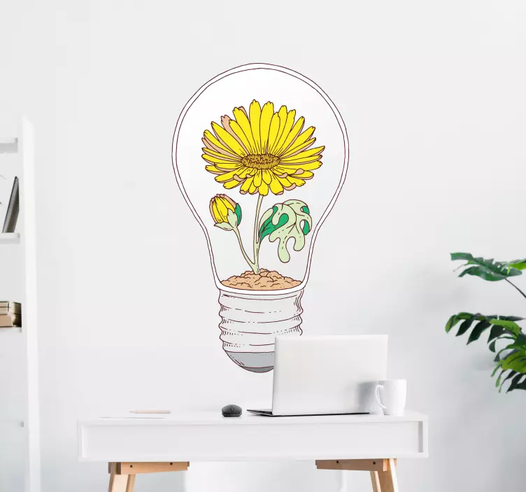 Hayvan Çıkartması - Çiçek açan ampulHayvan Çıkartması - Çiçek açan ampul, doğanın büyüleyici güzelliklerini evinize taşıyan eşsiz bir tasarım harikası. Sarı ayçiçekleri ve yeşil yaprakların zarif bir şekilde birleştiği bu kavramsal ampul illüstrasyonu, yaşam alanlarınıza enerji ve neşe katmak için ideal. Her detayında doğanın büyümesini simgeleyen bu tasarım, ev dekorasyonunuzu renklendirirken, aynı zamanda ilham verici bir atmosfer yaratır!