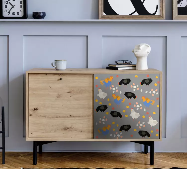 Hayvan çıkartması Çiftlik hayvanları deseniHayvan çıkartması Çiftlik hayvanları deseni, renkli ve eğlenceli tasarımıyla ev dekorasyonunuza neşe katacak! Bu özel grafik tasarım, sevimli tavuklar, hayvanlar ve çiftlik temalı figürlerle dolu, mobilyalarınıza ve yaşam alanlarınıza canlılık getiriyor. Şakacı bir atmosfere büründürmek için harika bir seçim olan bu çıkartma, dolma kalem gibi detaylarla zenginleştirilmiştir.