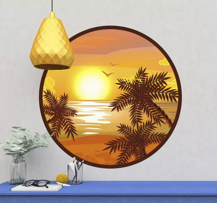 Hayvan Çıkartması - huzurlu gün batımı manzarasıHayvan Çıkartması - huzurlu gün batımı manzarası, göz alıcı grafikleriyle sizi tropikal bir plaja, palmiye ağaçlarıyla çevrili bir cennete götürüyor. Dairesel tasarımı, okyanusun huzur verici mavi tonlarıyla birleşerek, gün batımının sıcak renklerini evinize taşıyor. Doğa ile iç içe, sakin bir atmosfer yaratan bu tasarım, ev dekorasyonunuza eşsiz bir dokunuş katıyor!