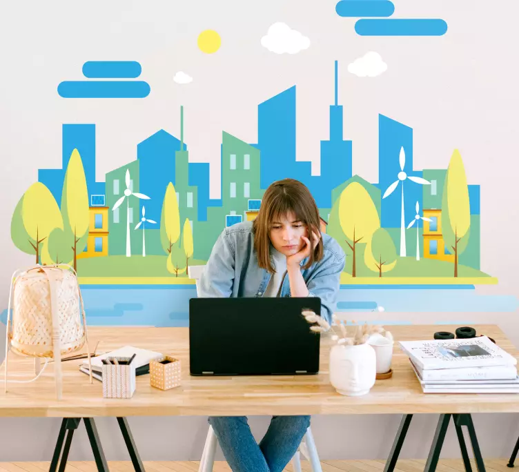Hayvan çıkartması modern Şehir manzarasıŞehir hayatının dinamik yapısını ve doğanın huzurunu bir araya getiren hayvan çıkartması modern Şehir manzarası, göz alıcı bir illüstrasyon ile karşınıza çıkıyor. Bu tasarım, yüksek gökdelenler ve zarif binalar arasında yer alan ağaçlar, su, rüzgar türbinleri ve güneşin sıcak ışıklarıyla dolu bir manzara sunuyor. Şehir silueti, modern yaşamın enerjisini yansıtırken, doğanın unsurlarıyla buluşarak yaşam alanlarınızı renklendiriyor!