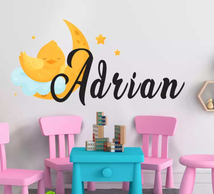 Hayvan Çıkartması Sevimli Ay TasarımıEv dekorasyonunuza neşe katacak Hayvan Çıkartması sevimli ay tasarımı, sevimli piliç figürü, huzur veren ay, ve uykuya dalmış bir bebek ile tasarlanmıştır. Kişiselleştirilebilir özelliği sayesinde istediğiniz isimle süsleyebilir, çocuk odası gibi mekânlarda kullanarak yıldızlarla dolu bir atmosfer yaratabilirsiniz. Bu özel tasarım, bulutlar arasında kaybolmuş bir hayvan illüstrasyonu ile odalarınıza sıcaklık katacak!