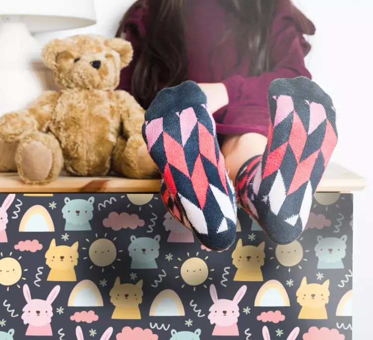 Referans: A51583Sevimli hayvan karakterleri, neşeli bulutlar ve güneşlerin yer aldığı eğlenceli bir tasarım. Pastel renklerin ve hayali unsurların birleşimi, çocuk odaları için mükemmel bir seçim yaparak neşeli ve davetkar bir atmosfer yaratıyor.