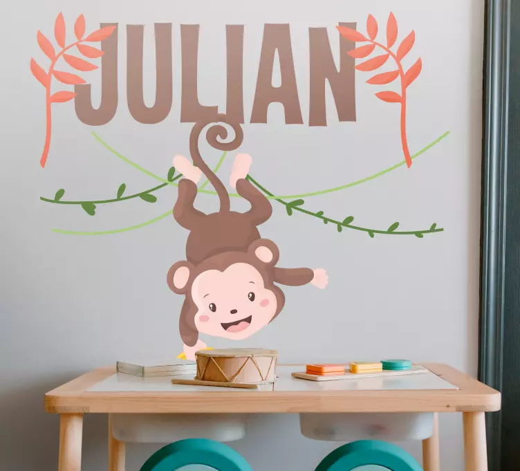 Referans: A49357Bir sarmaşıkta baş aşağı asılı duran sevimli bir maymunu içeren cazip bir tasarım. Tasarım, canlı yapraklar ve kişiselleştirme seçeneği ile çocuk odaları için mükemmel. Maymunun neşeli ifadesi, her ortama neşeli bir dokunuş katıyor.