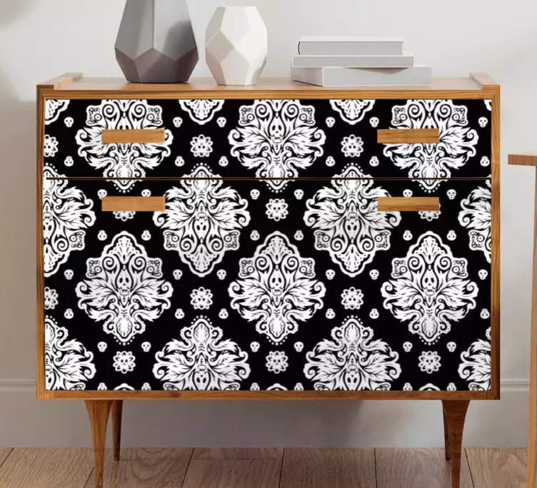 Hayvan Çıkartması - Şık desen kaplamaEv dekorasyonunuza modern bir dokunuş katmak için tasarlanmış Hayvan Çıkartması - Şık desen kaplama, mobilya, kafatasları, çiçekler ve şam gibi ögeleri harmanlayan etkileyici grafikleriyle dikkat çekiyor. Siyah ve beyaz tonlarının oluşturduğu süslü desenler, ev içi mekanlarınıza zarif bir hava katarken, modern tarzda bir mobilya tasarımı arayışında olanlar için ideal bir seçenek sunuyor.