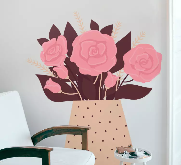 Referans: A48128Pembe güllerin yer aldığı, puantiye desenli bir vazoda sunulmuş güzel bir çiçek kompozisyonu. Bu tasarım, mekanlara zarafet katarken, çiçeklerin doğal güzelliğini kutluyor ve sıcak, davetkar bir atmosfer yaratıyor.