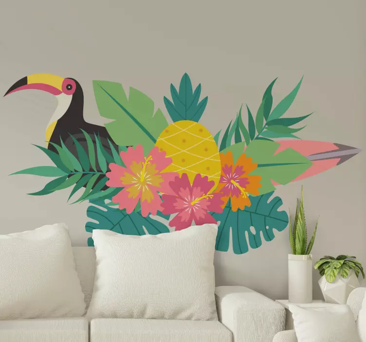 Hayvan Çıkartması Tropikal Kuş TasarımıRenkli ve canlı bir atmosfer yaratmak istiyorsanız, Hayvan Çıkartması tropikal kuş tasarımı tam size göre! Bu eşsiz tasarım, tropikal yapraklar, renkli tukanlar, ananaslar ve çiçeklerle dolu bir doğa manzarası sunarak, evinizi veya ofisinizi canlandıracak. Yeşillikler arasındaki bu muhteşem kuşlar, mekanınıza ferah bir hava katacak ve ziyaretçilerinizin ilgisini çekecek.