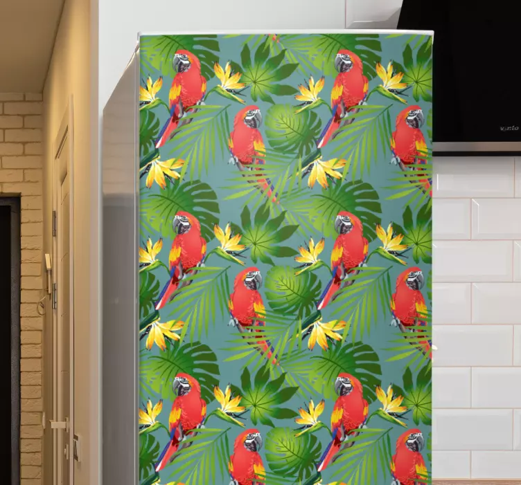 Hayvan Çıkartması Tropikal Papağan TemasıDoğanın canlı renklerini ve tropikal atmosferini evinize getirmek için tasarlanmış Hayvan Çıkartması tropikal papağan teması, şık yapraklar ve renkli çiçeklerle süslenmiş Amerika papağanlarını barındırıyor. Buzdolabınızdan yaşam alanlarınıza kadar her noktayı canlandıracak bu çıkartma, doğanın eşsiz güzelliklerini evinize taşımanın en keyifli yoludur!