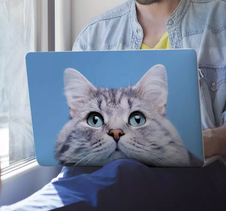Bu güzel sevimli kedi yüzü dizüstü cilt çıkartması, evcil hayvan sevenler için ideal bir seçimdir. Tasarımı, geniş gözleri açılmış gerçekçi bir kedi olan mavi bir arka plan üzerine yerleştirilmiştir.
