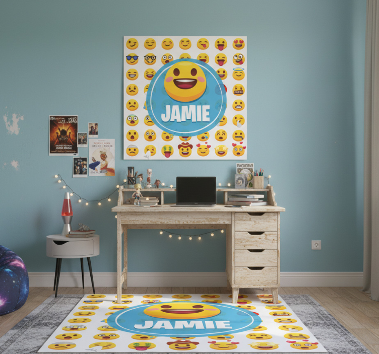 Bu canlı oda, rustik bir masanın üzerinde büyük bir emoji temalı afişle dikkat çeken eğlenceli bir dekorasyona sahip. Renkli emojiler, 'JAMIE' ismini içeren neşeli merkez parçasını çevreliyor. Işıltılı ışıklar ve eklektik sanat eserleri, samimi bir atmosfer yaratarak davetkar bir yaratıcı alan oluşturuyor. Genç odası duvar posteri emoji İfadeleri koleksiyonu