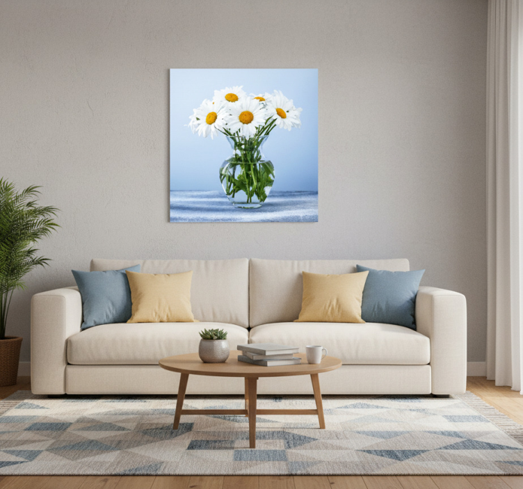 Oturma odası afişi cam saksılardaki papatyalar