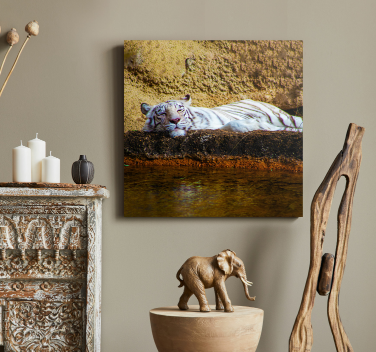 Referans: Q6655Sakin bir an, su kenarında uzanan beyaz bir kaplanla yakalanıyor; bu, onun huzurlu tavrını sergiliyor. Kaplan, dokulu bir arka plana yaslanmış, belirgin çizgilerini ve huzurlu ifadesini vurguluyor, sahneyi zenginleştiren doğal unsurlarla çevrili.
