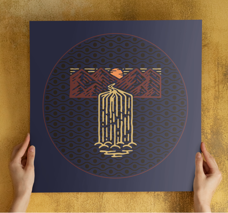 Referans: Q7828Şelalenin stilize dağ zirveleri arasında döküldüğü ve gün batımının yer aldığı huzur verici bir kompozisyon. Dairesel tasarım uyum katarken, karmaşık çizgiler doğayla bağlantı ve huzur hissi uyandırıyor.