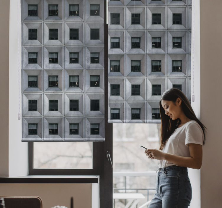 Pencere Stor perdeler olarak bir brütalist modele sahip olmak harika değil mi? Bu tasarımla, alanınız tam orada yapısal binaya sahipmişsiniz gibi görünecektir. Görsel efektli stor perde, camlı beton geometrik blok pencereleri gösteriyor.