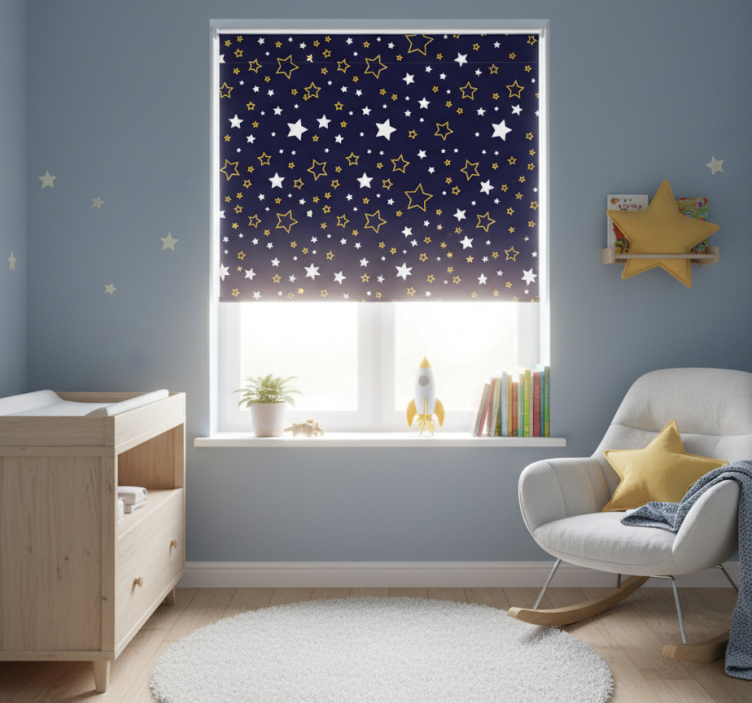 Çocuk odası stor perde beyaz ve sarı yıldızlı gece gökyüzü