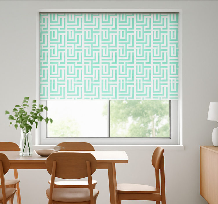 Mavi geometrik kareler efekti yemek odası stor perde