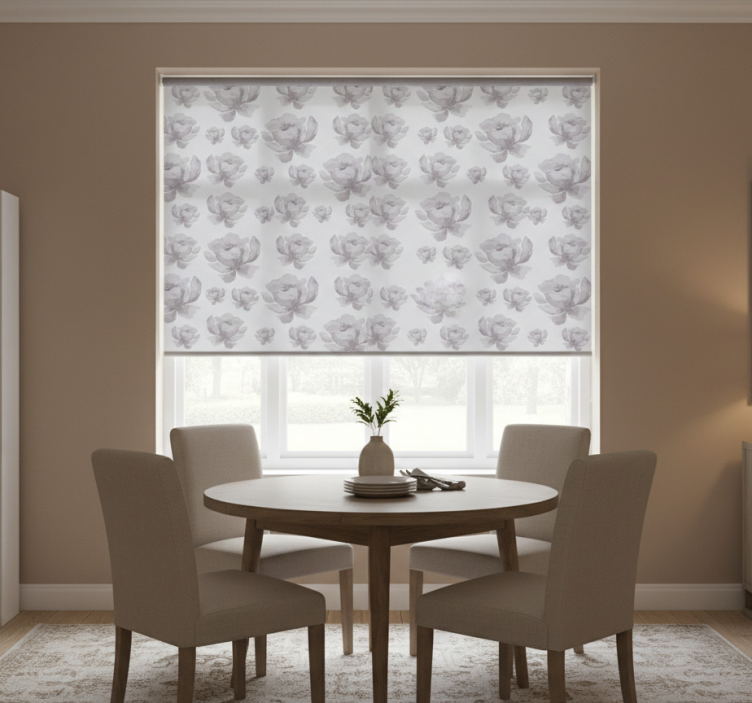 Yemek odası stor perde gri 80'ler çiçek deseni