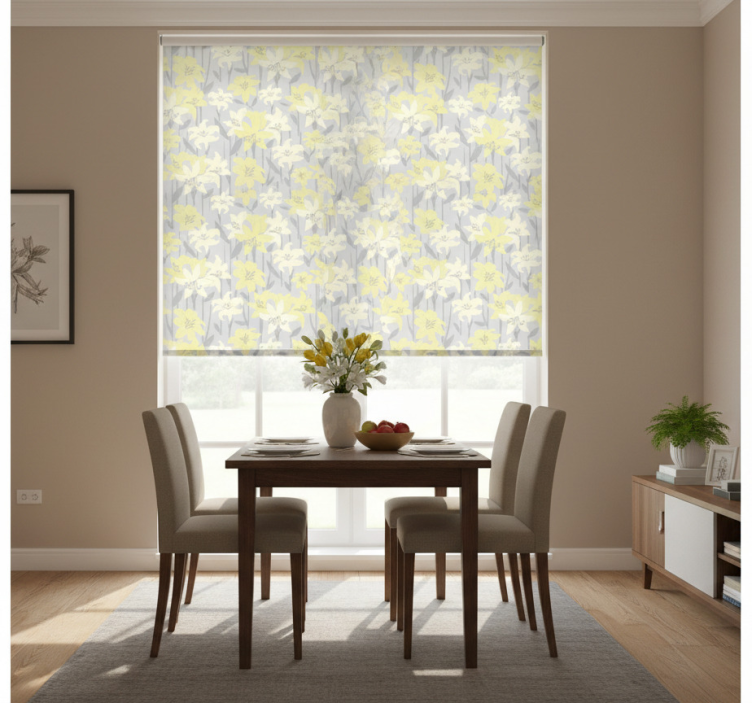 Yemek odası stor perde gri arka planda sarı çiçekler