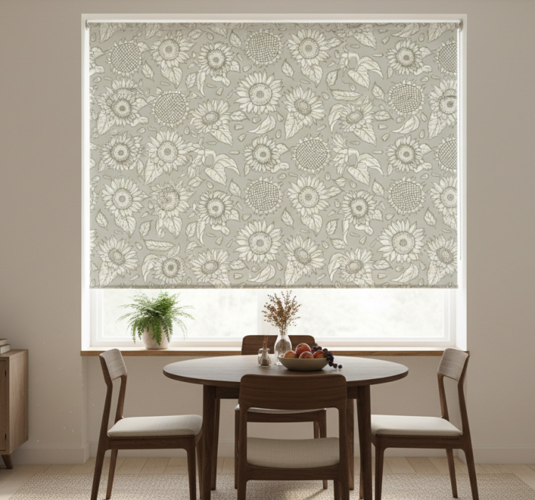 Yemek odası stor perde gri ayçiçekleri