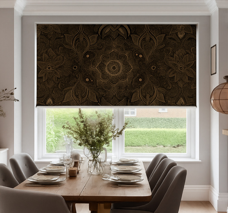 Yemek odası stor perde siyah ve altın mandala