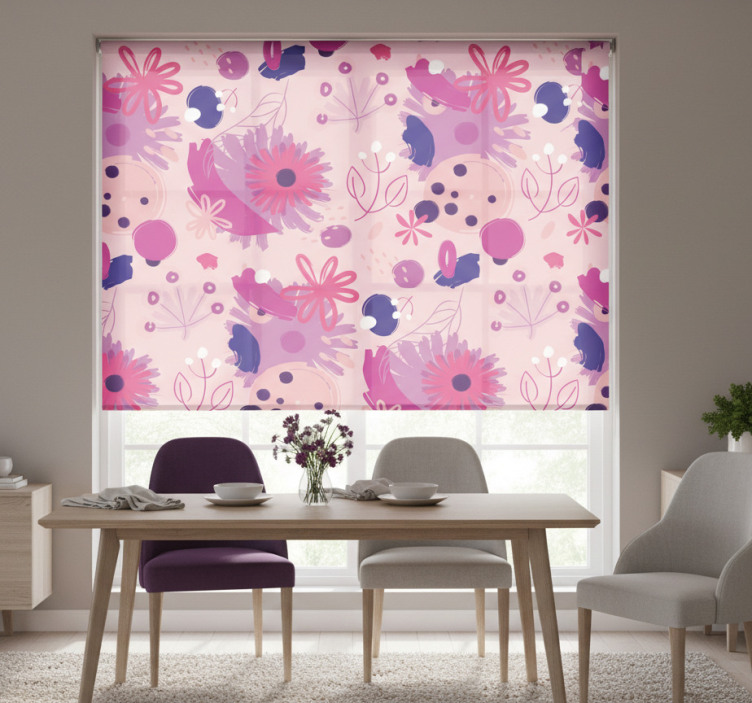 Yemek odası stor perde soyut mor çiçekler