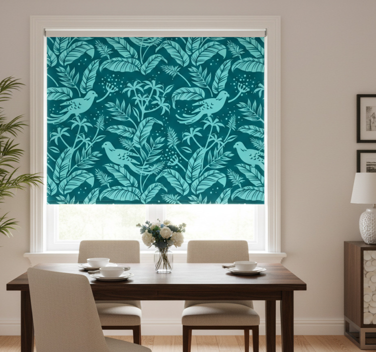 Yemek odası stor perde turkuaz uçan kuşlar
