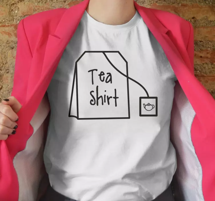 Bu ürün, kaliteli kumaşlar kullanılarak sizin mutluluğunuz düşünülerek yapılmıştır. Basit bir çay poşeti ana hatları içeren tasarımın içinde 'çay gömleği' yazan bir metin bulunur.