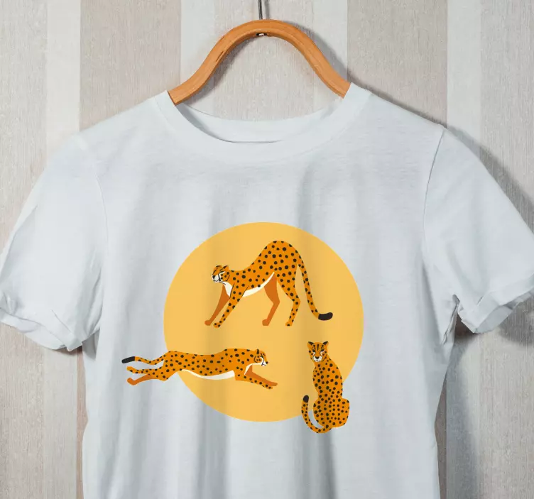 Referans: T4493Bu şık parça, enerjik bir turuncu dairenin önünde eğlenceli pozlarda üç sevimli animasyonlu çita sunuyor. Neşeli tasarımı çocuklara hitap ediyor ve genç hayvan severler için çekici bir seçim haline getiriyor. Günlük geziler veya eğlenceli maceralar için ideal.