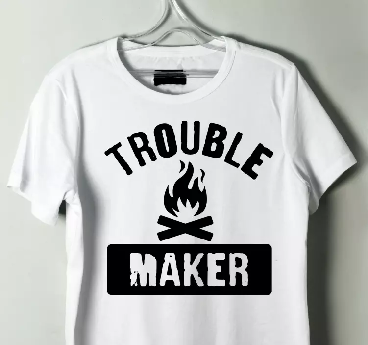 Referans: T5448Bu dikkat çekici tasarım, 'Trouble Maker' yazısını cesur bir şekilde sunarken, alev ve kamp ateşi sembolleriyle de destekleniyor. Eğlenceli ve maceracı bir ruhu benimseyenler için mükemmel bir seçim. Siyahın beyaz üzerindeki kontrastı, heyecan katıyor ve dikkat çekmeyi kolayca sağlıyor.