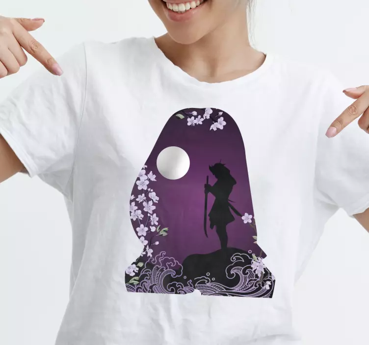 Referans: T4771Bu şık parça, canlı bir mor arka planda kiraz çiçekleri ve bir ayın arasında bir savaşçının siluetini sergiliyor. Çiçek unsurları, sanatı giyimde takdir eden ifade dolu bireyler için mükemmel bir zarafet katıyor.