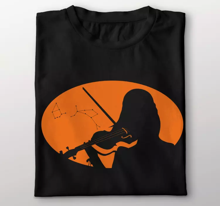 Referans: T4530Bu çarpıcı tasarım, arka planda takımyıldızlarıyla birlikte yıldızlı bir gökyüzünün altında bir kemancı silueti sergiliyor. Canlı turuncu daire, siyah kumaşla güzel bir kontrast oluşturuyor ve müzik severler için mükemmel bir seçim. Özel günler veya günlük giyimler için idealdir.