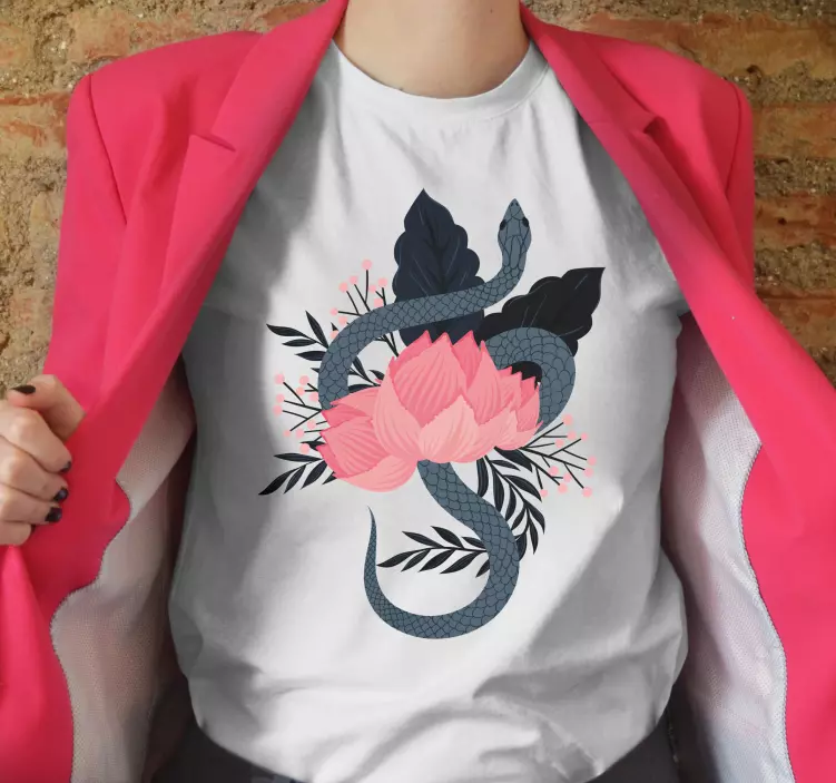 Tişört Yılan ve Çiçek MotifiDoğanın zarafetini yansıtan tişört yılan ve çiçek motifi tasarımı, yılan, lotus, yapraklar ve çiçeklerle süslenmiş modern bir görünüm sunuyor. Pembe ve siyah renklerin stilize kullanımı, botanik temalı bu tasarımda doğanın tüm canlılığını gözler önüne seriyor. Her ayrıntısında doğanın büyüsünü hissetmek isteyenler için mükemmel bir seçenek!