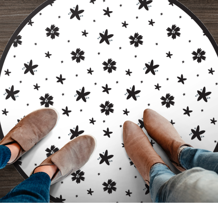 Çiçekler ve bitkiler pvc halı Çiçek yıldız deseniÇiçekler ve bitkiler pvc halı Çiçek yıldız deseni, zarif çiçek desenleri ve modern grafik unsurlarıyla evinize ferah bir hava katmak için tasarlandı. Şık siyah ve beyaz renk paleti, her türlü dekorasyon tarzıyla mükemmel uyum sağlar. Bu özel vinil kilim, çiçekler ve bitkiler temalı tasarımıyla, yaşam alanlarınıza estetik bir dokunuş getiriyor.