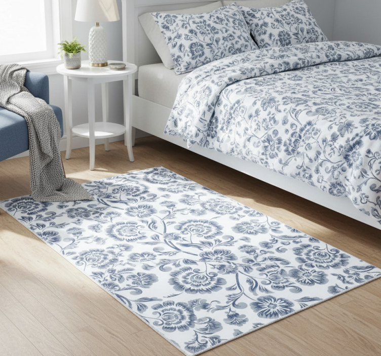 Yatak odası pvc halı mavi çiçekler grandmillenial deseni