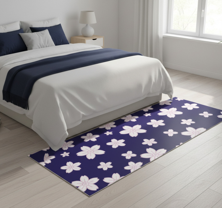 Yatak odası pvc halı mavi zeminli vintage erik çiçeği deseni